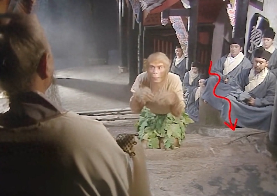 猪八戒前往花果山找猴哥的时候,在“群猴戏”里面可以非常明显看到,有一位群演在镜头转过来的时候,才忙急忙慌的将猴子头套给戴上。