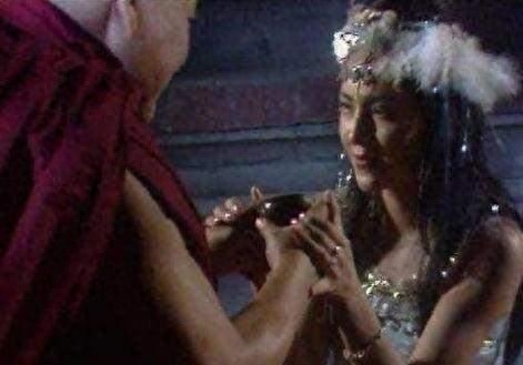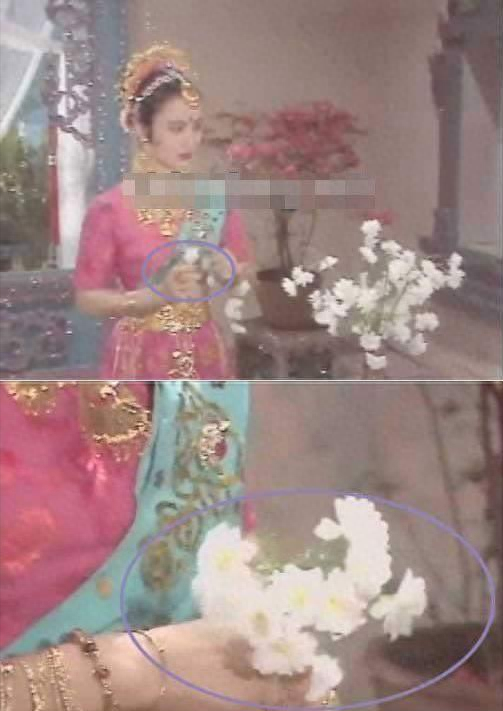 孙悟空突然走进房间,玉兔精慌乱的拿了一枝花装傻,但下一个特写镜头当中,这一朵花突然变成了一束花。