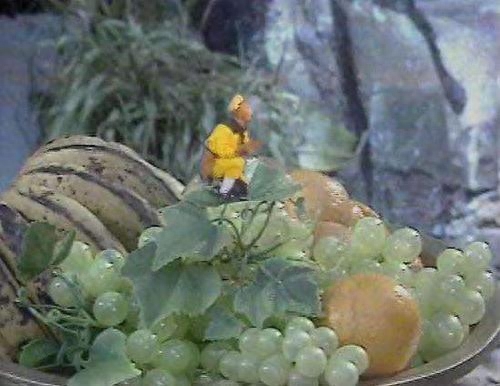 悟空变小了出现在一叠果盘里面,从特写镜头当中可以明显的看到,那些葡萄每一个都像气球一样,可以明显的看出来是塑料道具。