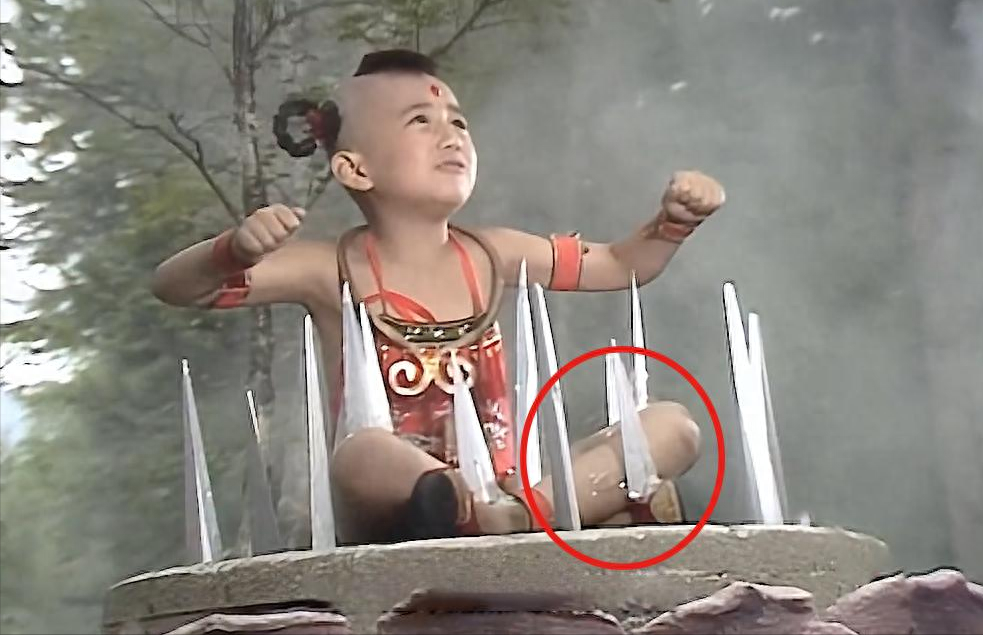 可以看到红孩儿坐在莲台上的时候,上面那一根根尖锐的武器都是纸板,并且还能看到红孩儿的左腿上,有一些反光的如同透明胶带的东西。