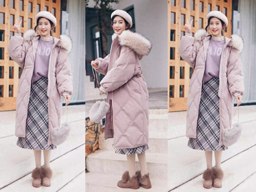 很显气质的一款粉色长款羽绒服,甜美少女feel,轻薄羽绒的材质,冬天穿起来不仅时尚好看,还保暖,关键的是一点都不显臃肿感,大大的毛领设计,是今年最流行的款,还可以保护的你颈脖显温暖感,还超显脸小的,比较立体的剪裁,干练又利索,轻松彰显出大气的气息,衣身做了压褶的格纹点缀,个性又多了一点复古的味道,长款的版型,内搭格子半身裙,很温柔也很女人,寒冷的冬天,当然少不了毛毛靴的穿搭,这样穿才时髦好看又温暖。