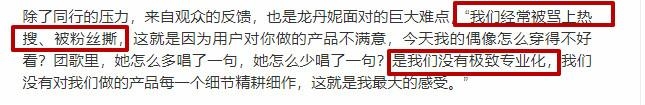 面对这种质疑,龙丹妮还特意在年初接受采访时回答了,称这确实是自己的问题——经常被骂上热搜、被粉丝撕,主要是“我们没有极致专业化”。