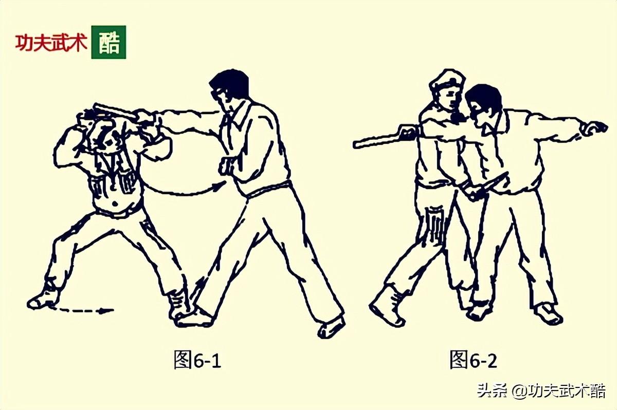 我方右手反握匕首,以左格斗式站立对敌;敌方上右步,右手持短棍劈击我方的头部;我方立即向右转身,双腿屈膝成半马步,同时用匕首刀刃向上架挡敌方的短棍,左手推挡敌方的右手腕,化解敌方的进攻(图6-1)。上动不停,我方左手继续缠住敌方右手腕,迅速向左转身;随即双脚向左、向前斜形滑步,进身至敌方右臂外侧,同时右手的匕首随之下落后再向前成弧形挑刺敌方的腹部,将敌方重创(图6-2)。