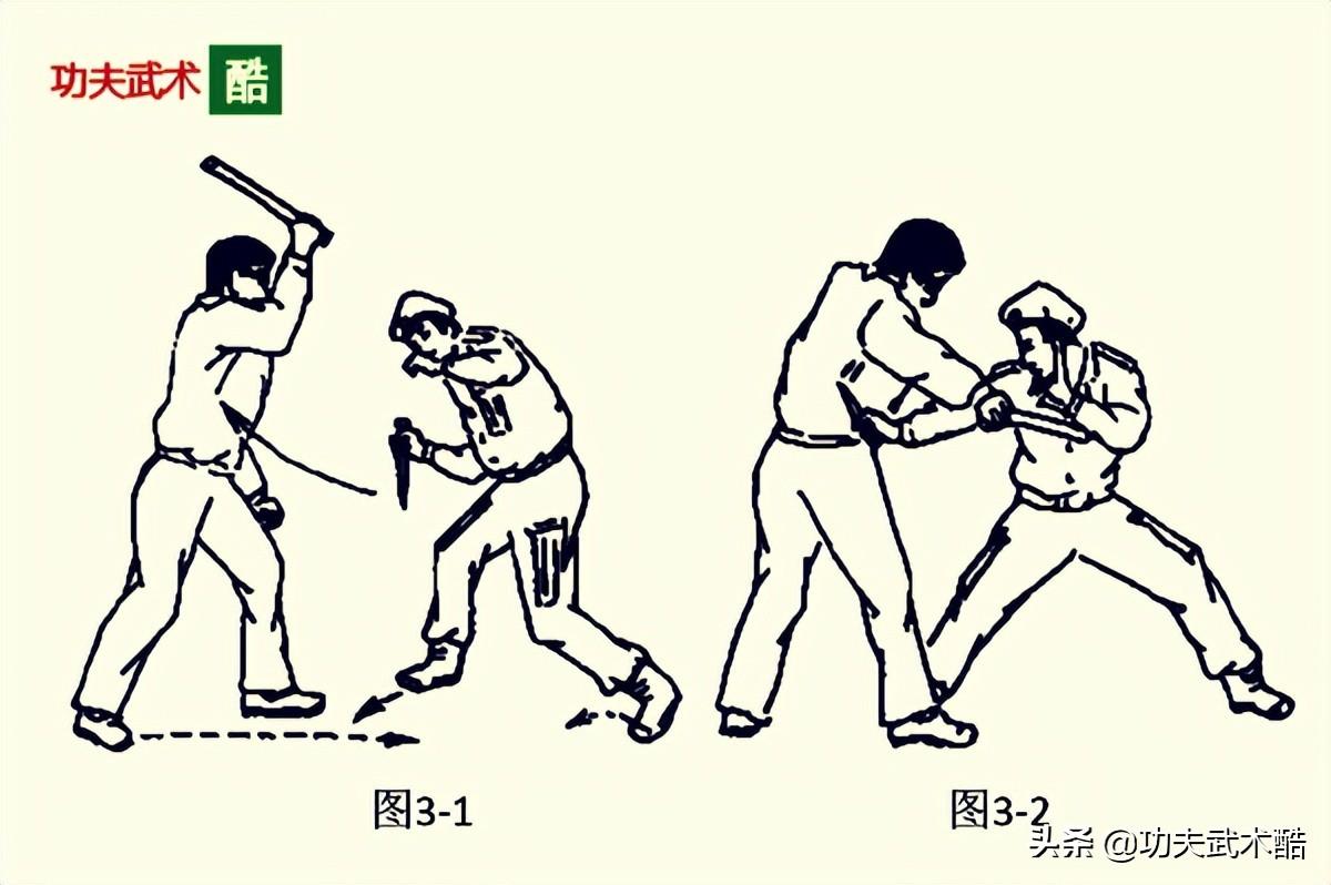 我方右手正握匕首,以左格斗式对敌;敌方上左步,右手持棍劈击我方头部;我方右脚立即向前、向右斜形上步,左脚后撤,身体左转的同时上身向右侧身,闪躲开敌方短棍劈击,同时左手护于下颌前(图3-1)。上动不停,当敌方的棍体下落时,我方双脚迅速向左横滑步进身,快速用匕首横刺敌方右肋,将敌方重创(图3-2)。