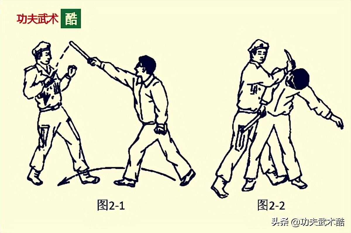 我方右手反握匕首,以左格斗式站立对敌;敌方上左步,右手持短棍劈击我方头部(图5-1)。我方不等敌方短棍下落,右脚迅速向右、向前斜形上步,左脚后摆,上身左转并向右侧身,同时用匕首的刀刃横划敌方的右手腕(图5-2)。