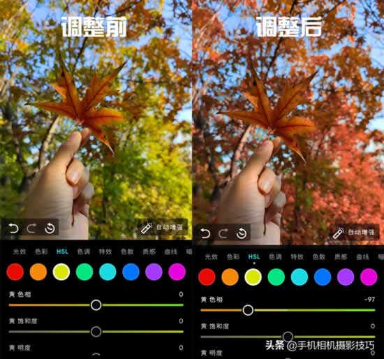 如果你拍出的秋天不够红,同样可以用HSL功能调整改变。