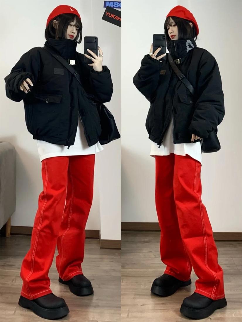 比较喜欢穿短款羽绒服的年轻姑娘,建议一定要尝试下“三明治”的配色思路,头部和腿部的红色服装,能让穿搭瞬间变得有亮点、高调。比如小姐姐这身造型就很值得借鉴,美得很有自己的格调和特色,还很显青春活力。