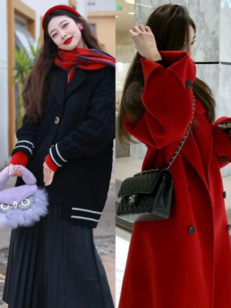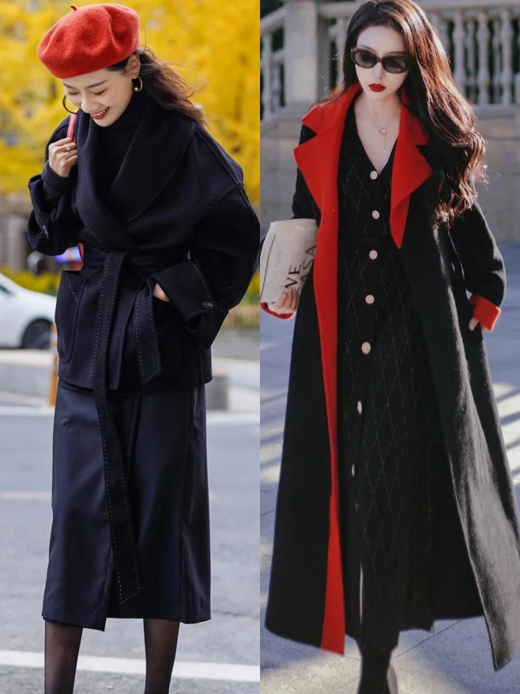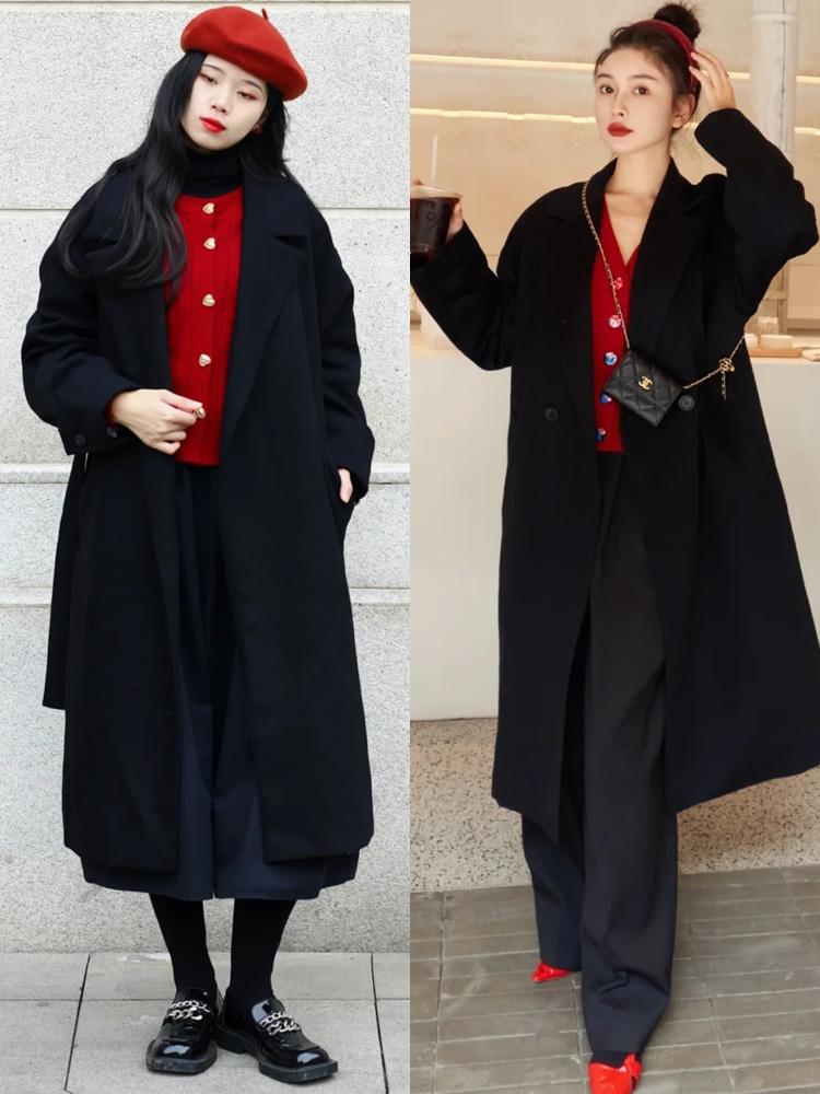 比如博主这种红色大衣造型就很不错,不管是搭配黑色长裙或紧身裤、长靴,都十分的好看。而且利用黑色服装的沉稳、大方,成熟女性魅力也得到了展现,还很有知性美。