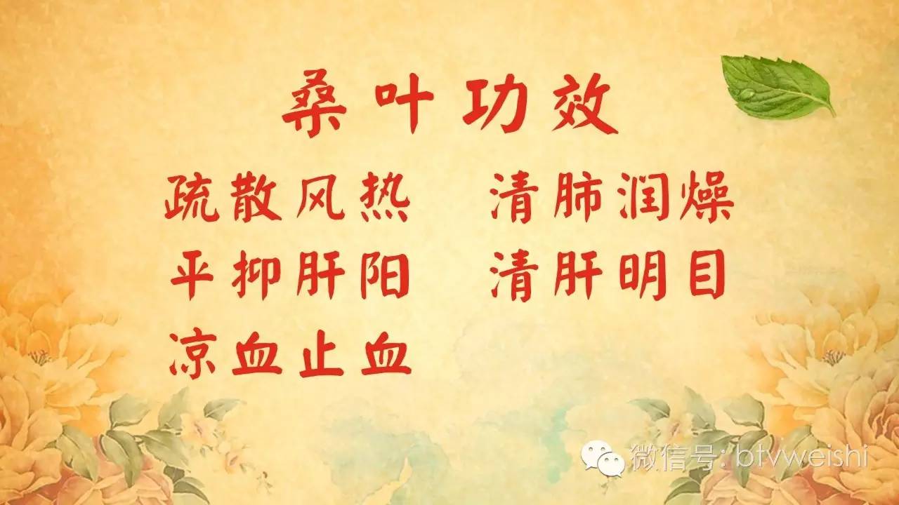 王莒生王老年轻时,从四川刚到北京来上学的时候经常闹嗓子,觉得干,睡觉起来也难受,由于平时还参加了学校的文艺队,特别注意保护嗓子。由于妈妈家里是开中药铺的,爷爷会一些中医,所以父亲也跟着学了一些。所以当时家长给她用了一个“果子”泡水喝的办法。从此养成了喝保健饮的习惯。经过近40年的调整,王老现在的调养茶里一共有三味药,第一味就是桑叶,具有清肺润燥,清肝明目的效果。同时还有降血压、降血脂、降血糖、预防心肌梗塞和脑溢血的作用。