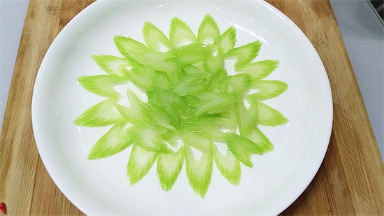 6.把西芹撕去丝,然后斜刀切成片。水中烧水,水中加食盐和食用油(这样焯水的西芹片更绿和口感更佳脆)。水开下入西芹片,1分钟左右捞出,然后摆入盘中备用。