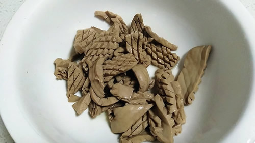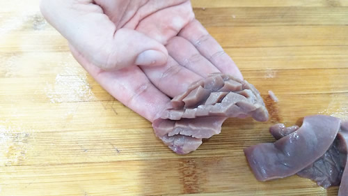 1.把猪腰从中间切开一分为二,切去猪骚(这个地方是最骚的,一定要切干净),先斜刀45度切,不要切断,然后再直刀切,5刀处断。最后把切好的猪腰放入清水中洗去血水。