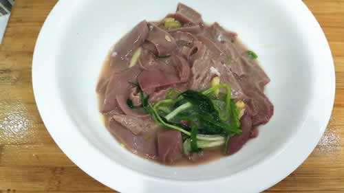 3.把洗好的猪腰片放入一个盆中,然后加入葱姜汁和一点食盐(加入食盐为了增加底味),用手抓匀,然后腌制15分钟。