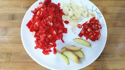 4.在一个盘中准备蒜片,生姜片,红椒粒,小米椒圈(能吃辣的可以全部用小米辣)。