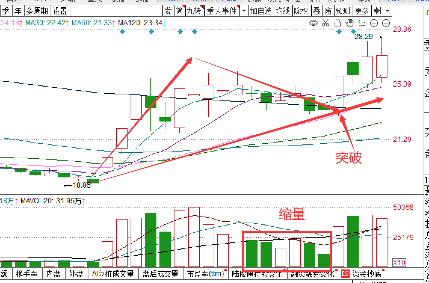 2、放量突破,成交量放大意味着场外资金的流入,是股价未来上涨的基础,主力意愿做多;