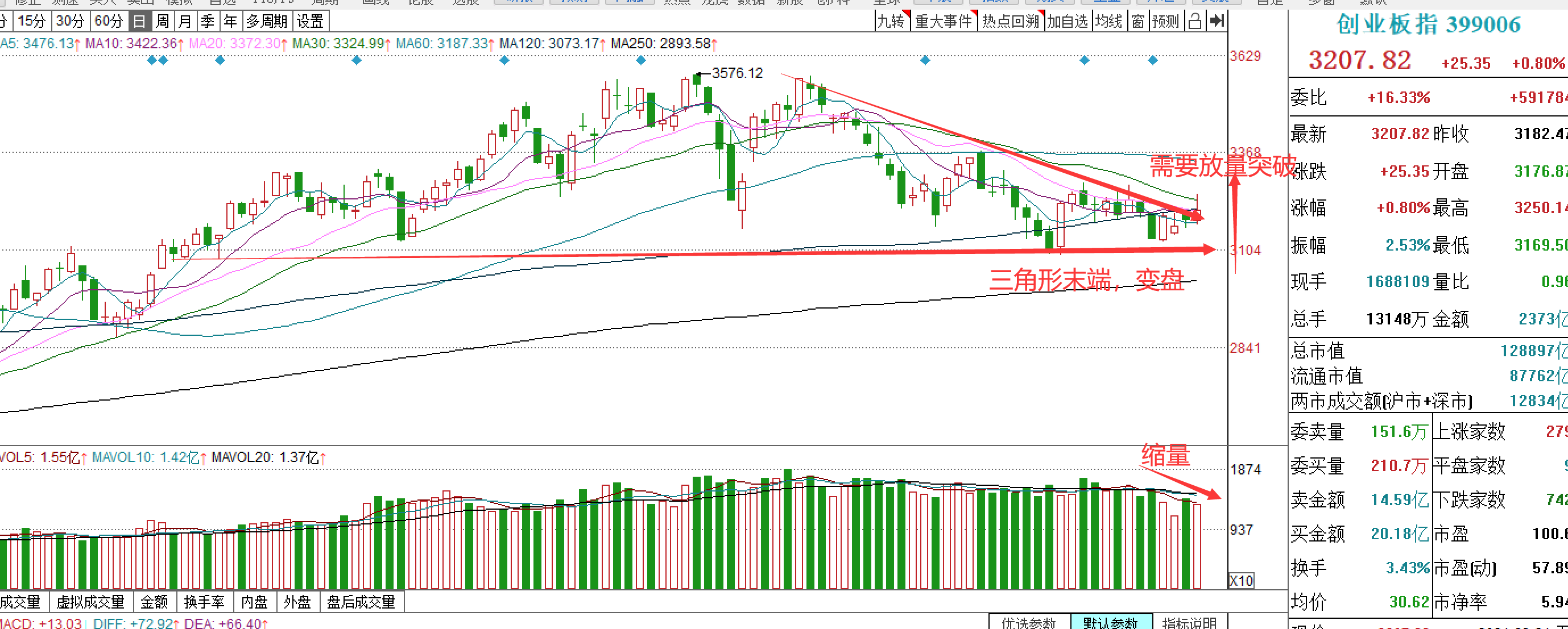 比如现在的创业板指数,就是一个三角形的变型,三角形的末端需要变盘,如下图: