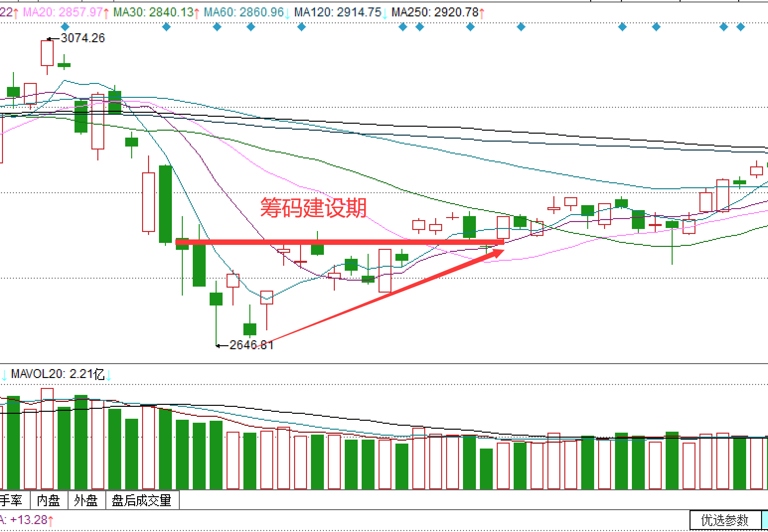 上图显示股价在经过大跌后,开始企稳,成交量从左往右递减,价格呈现盘整的格局。