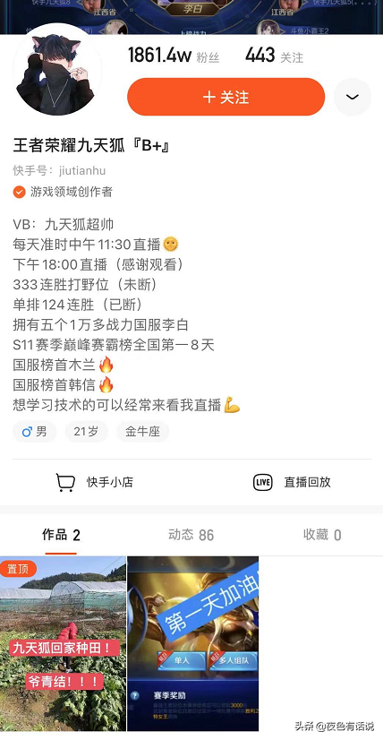 想要了解九天狐,我们可以上KS搜索‘九天狐’,九天狐作为在全网拥有近2000w粉丝的主播,他可以称为是王者荣耀主播一哥。就这样一个实力与颜、人气与口碑并存的主播,却在最近被发现删除了所有作品转而回家种地了。我们现在看九天狐的主页会发现,他的作品全都看不见了,唯一能看到的就是他回家种地的作品,视频内可以看到他家在一个山区,家里有这很大面积的地。但是,这样一名顶尖主播为什么就突然回家种地了呢?