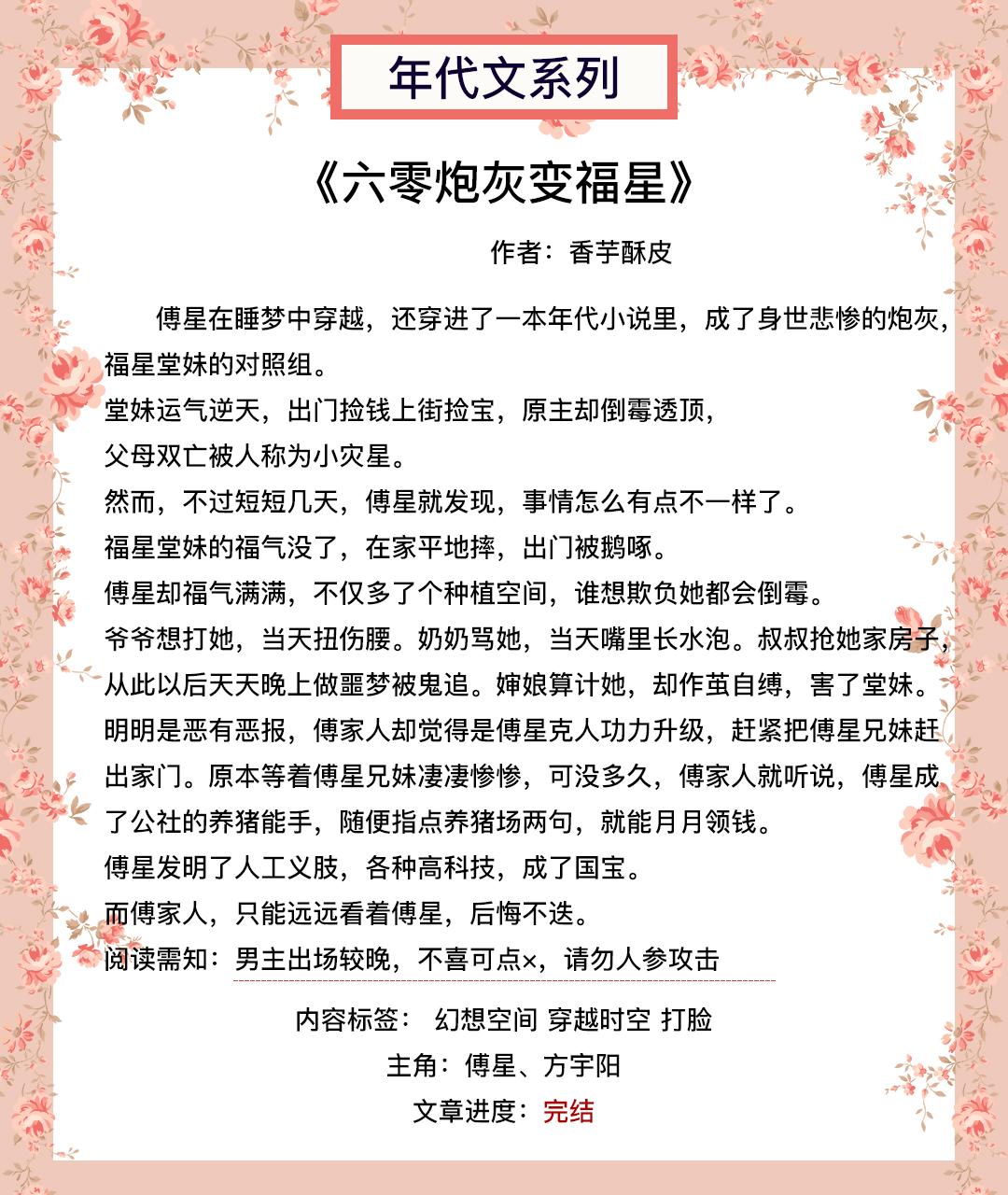 【短评】:这本主要讲的是女主穿到六零之后发家致富,把所有技术都提前发布带领国家更快发展起来。男主就是一个工具人,为了证明女主事业爱情双丰收的存在。快完结了才出场!出场就基本完结了!