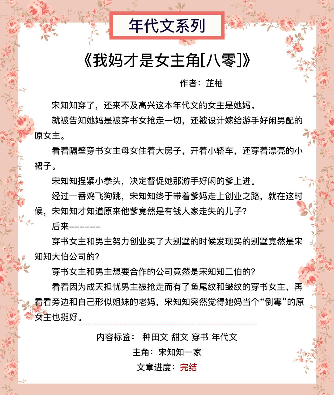 【短评】:宋知知穿进一本年代文,成为原女主的女儿,穿书女主抢了男主不说,还不忘踩她妈一脚,更是设计她妈嫁给队上的混子,后来,混子爹认祖归宗,一家人齐心合力创业过上好日子。