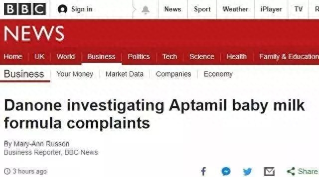 据英国BBC报道,法国食品制造商达能旗下的爱他美(Aptamil)婴儿配方奶粉更改了3款产品配方,百名英国家长在爱他美的Facebook页面留言,称孩子饮用新配方奶粉后呕吐。目前,达能集团表示已展开调查,表示将“认真对待一切反馈”。