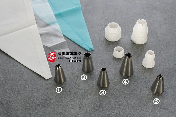 2.裱花袋:包括最常用的一次性塑料裱花袋、适用于较硬面糊(如曲奇、泡芙面糊)的布裱花袋和硅胶裱花袋