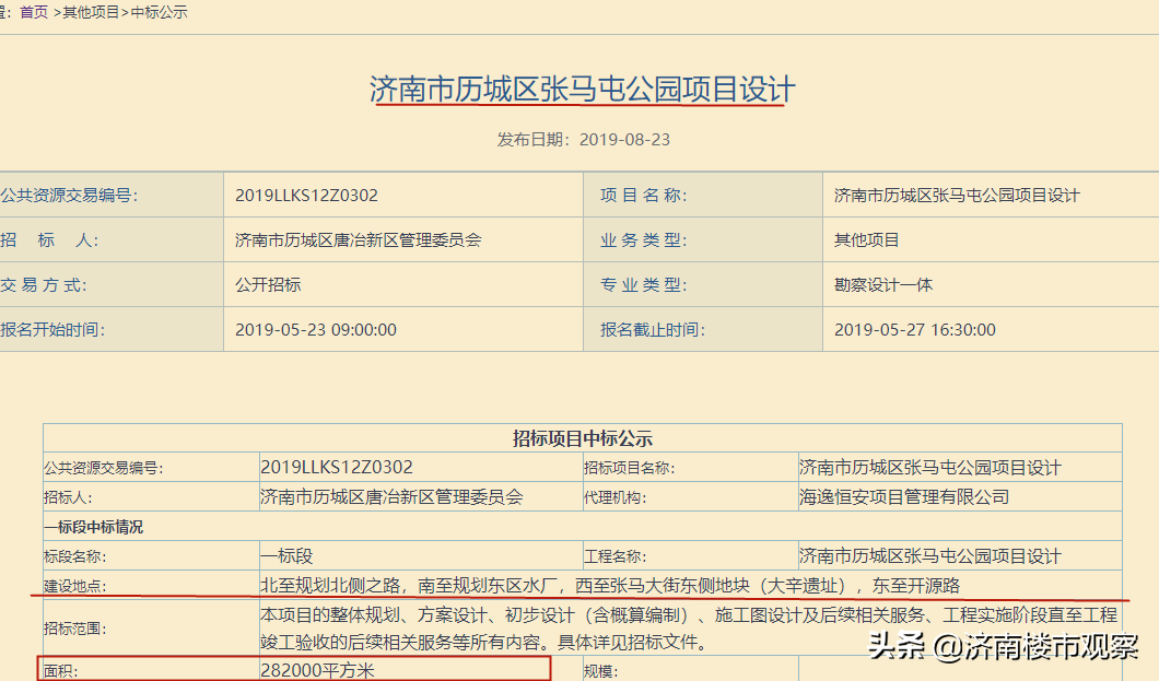 最近,一个名为“历城区张马屯公园”的项目进行了设计招标,并且已经公示中标单位。根据公示信息,这个公园占地面积28.2万平方米,也就是约423亩。