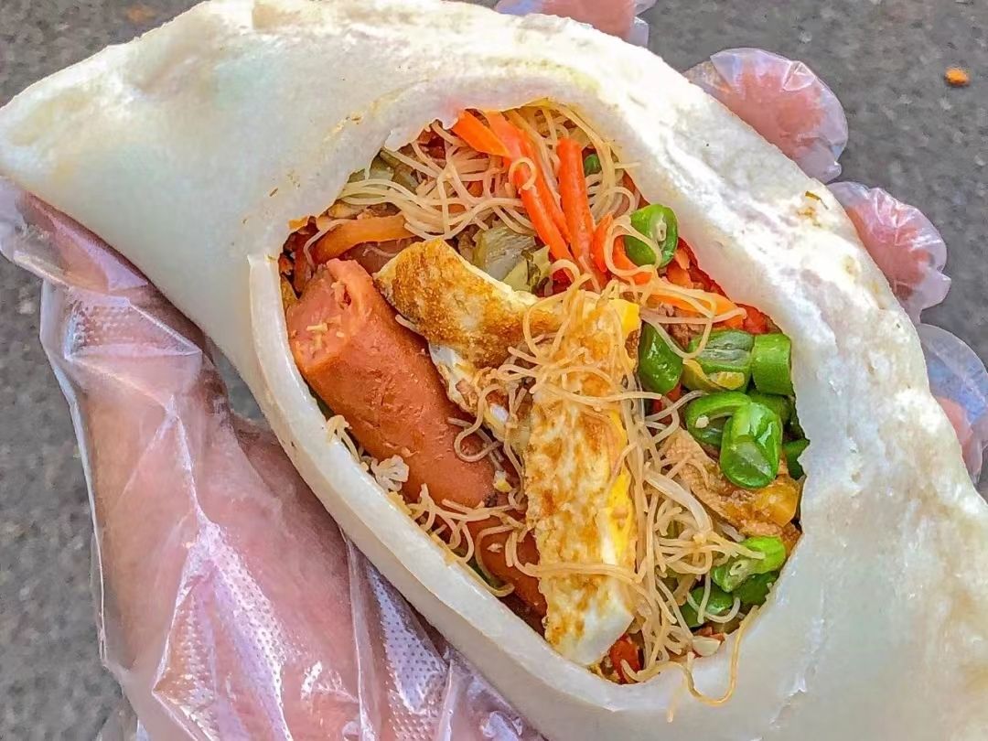 泡好的米线加上各种调料,然后倒进锡纸,里面有些豌豆、胡萝ト丝,还加了香菜,配菜简单,但是味道很鲜,烤好了就尽快吃,不然会坨,跟炒的口感不一样,烤米线吃着还有点焦香味,挺好吃。
