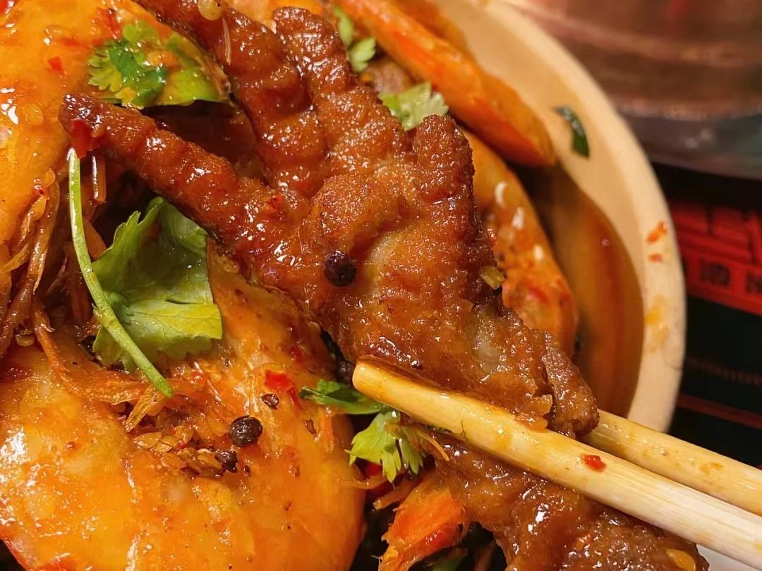 每一样食材都能够腌制得很入味,签上的牛肉都很大块,每一口都是地道川味。牛肉吃起来也十分的鲜嫩,轻轻一咬就在口中爆汁,再蘸上秘制酱料,一口入魂,尝一口一整天都回味无穷。