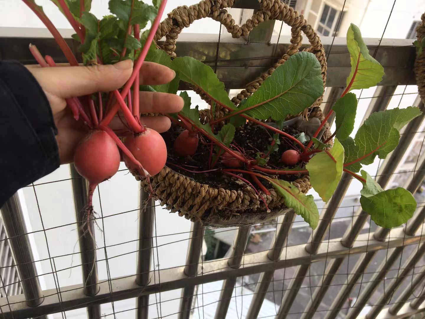 辣椒,各色甜椒等也可以种起来。樱桃萝卜等,菜市场不怎么常见的蔬菜都可以自产。只要利用好挂着的盆。