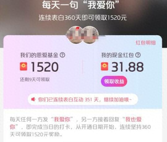 现代快报讯(记者 吕洁 于露)每天和对象说一句“我爱你”,本就仪式感满满。坚持打卡360天,还可领1520元,这促使不少情侣入驻了“小恩爱”APP内的“恩爱银行”。不过,最近多位用户反映,“恩爱银行”12月26日发布公告,宣布将于2019年最后一天关闭“恩爱银行”的开通入口,且按目前的资金只可供约1679名老用户申领红包。这到底是怎么回事呢?12月30日现代快报记者展开了调查。