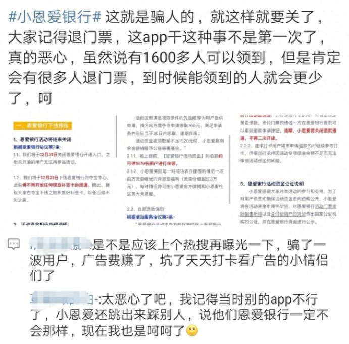 12月30日,现代快报记者搜索并下载了这款“小恩爱”APP,并就“恩爱银行”相关问题联系上了客服。一名客服表示,按照活动的服务协议第七条,恩爱银行活动主办方有权随时终止活动。根据活动的开展实际情况,他们最终决定在12月31日关闭活动开通入口,如果用户正在打卡,可以自行决定是继续打卡或退还1元门票款。