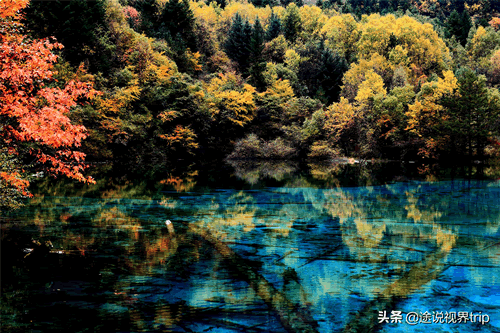 水流遇到植物,植物光合作用把二氧化碳当饭吃了,碳酸钙就沉积在植物上。白色钙华打底,水中钙镁离子让水体散射了阳光中蓝紫光。湖水呈现湛蓝和碧绿色,就形成了水光浮翠,倒映着林岚的九寨沟风景。在地球上,这种美妙的钙华沉积少之又少,以九寨沟为最。