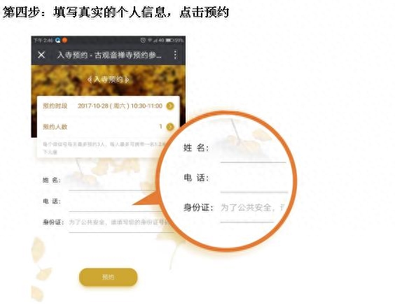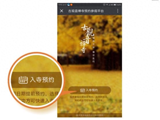 据了解,每年赏银杏的市民、游客排队时间长达四五个小时, 2016年11月13日,一天之内就有7万多游客慕名而来,游客难免有怨言,拥挤的游客也给寺院的清净带来严重困扰。为了让更多人能有更好的观赏体验,禅寺与陕文投云创科技合作,打造了集在线预约、客流统计、数据分析、智慧支付、全景导览、义工招募等功能于一体的智慧寺院系统,已于10月18日正式上线。即日起游客可通过“古观音禅寺”官方微信号进行提前预约。古观音禅寺开放的银杏观赏时间为2017年10月28日—12月10日期间的每天8点到17点。