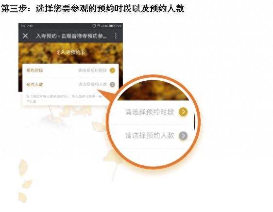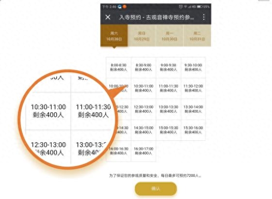 陕文投云创科技技术总监郑超表示,为了保证参观质量和安全,预约系统以半个小时为1个预约时段,每时段可预约400人,每日最多可预约7200人。每个微信号每天最多预约3人,每人最多可携带一名1.2米以下儿童。预约时需按要求真实填写个人身份信息,预约成功后需按时前往,由工作人员扫描预约二维码后方可入寺参观。如遇突发情况不能如期参观的,需提前8小时取消,但不足8小时则不能取消。预约未到者,该账号将被冻结7天不能预约,同时该账号预约的其他时段也将失效。