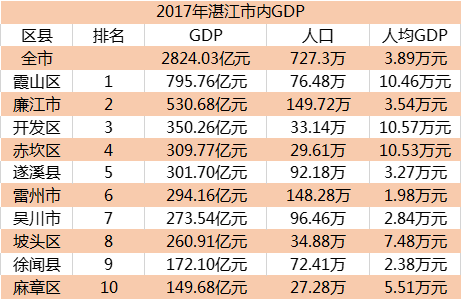 现在小编回答哪个县市是湛江的垫底王。答案是雷州。虽然雷州2017总体GDP并不是垫底,但是人均GDP是垫底的,而且是唯一一个在两万以下的县市。更重要的是雷州市是湛江面积最大的区县,人口也和廉江差不多,因此正常来说,应该GDP和廉江差不多才对,但是天时地利人和可能都不对,因此经济就成了湛江的垫底王。