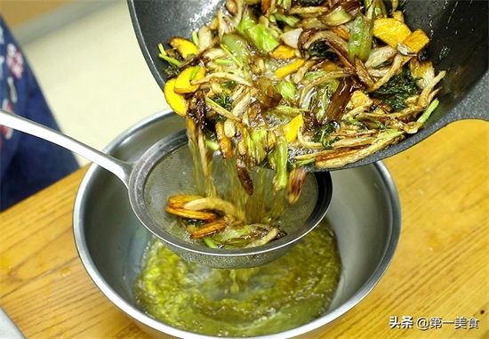 ,一直把原料炸至金黄发干,倒出来控出里面的料渣,葱油就炸好了。