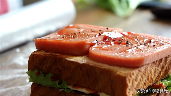 步骤七:再放上一片吐司片,吐司片上面涂沙拉酱,放上两片火腿,在火腿上涂一层番茄酱,撒上黑胡椒碎,放上生菜,和最后一片吐司。
