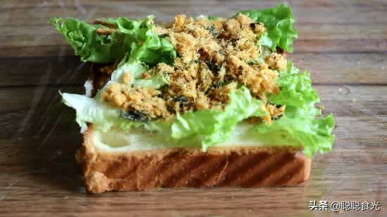 步骤五:铺上生菜,生菜尽量用嫩一些的生菜心,然后在生菜上面撒上一些肉松。