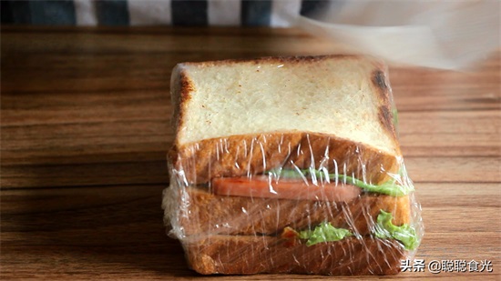 5、用保鲜膜固定是因为三明治夹馅太厚,吃起来容易散开,如果不喜欢太厚也可以不用保鲜膜定型。