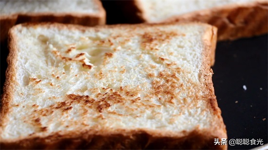 步骤三:把切片吐司放入平底锅,锅中不需要刷油,煎到一面变色后,翻面,把两面都煎到微微上色。这一步也可以用吐司机来完成,吐司机烤出的更香。