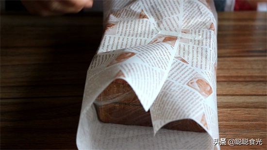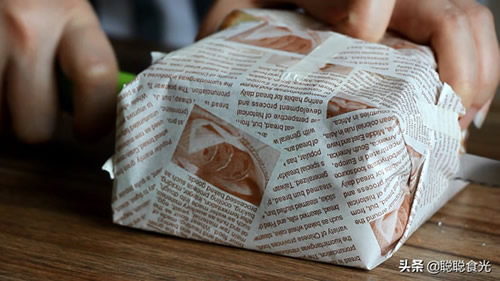 步骤九:再准备一张油纸,油纸的光滑面朝上,把三明治放在油纸中间,两边对折,用纸胶带固定。