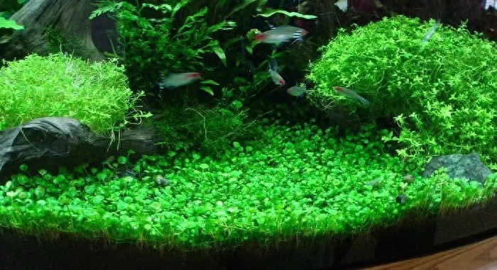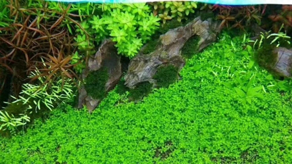 矮珍珠虽属有茎类水草,但茎部却不是直立的,而是爬行在底部生长,是一种美丽的装饰性前景草。强光下通常长不到2厘米高,但可以长得很浓密。绿色的匍匐枝附有短根组织,对生匙形叶长约8毫米,宽约3毫米。由于爬行生长的匍匐枝会呈扩散状蔓延开来,最后会铺满整个底床,而匍匐枝上的叶片又是浓密地生长,感觉起来宛如草坪一般。一般在种植矮珍珠时要避免柔软的细根无法顺利攀附在底砂之中,因此在底砂的选择上应尽量使用较细的砂子,用水草泥会更好。草坪的厚度超过2厘米就必须修剪,否则下面的茎叶就会因为缺乏光照而变白并腐烂,严重的会导致整块草皮浮起来。