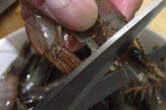 然后用水冲洗后,直接剪掉头部,剪去虾尾巴和胸鳍部分,除去虾线,挤出虾尾中残留排泄物。