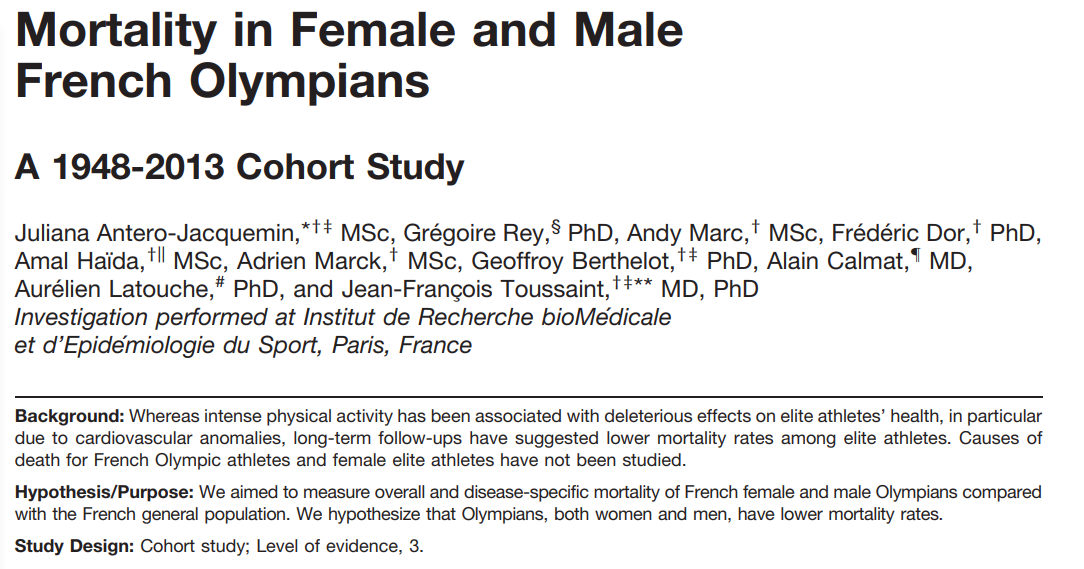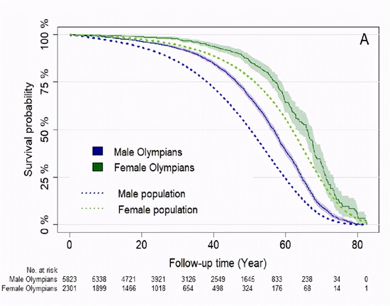2015年发表的对1948年至2010年参加夏季或冬季奥运会的所有2400多名法国运动员的研究显示,他们的标准化死亡率比普通人低41%,运动员平均预期寿命比匹配的同年龄人群对照组平均长6.5岁。