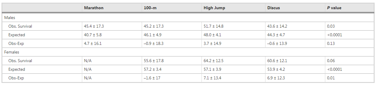 比如,2017年发表的1928年至1948年之间的每届奥运会跳高,铁饼,马拉松和100米短跑前20名获得者的研究中,找到资料的429人中有336人确定了死亡日期。