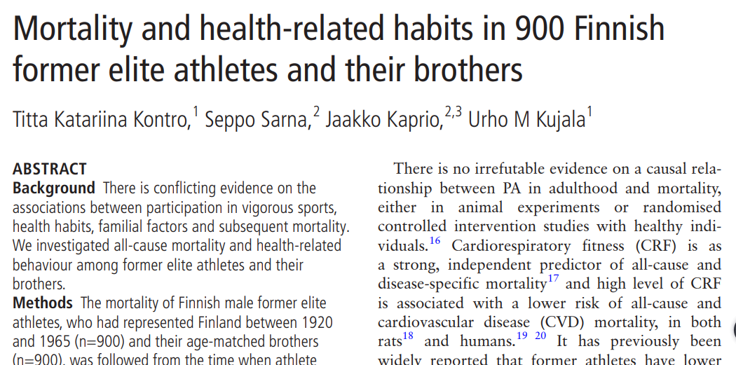 2018年,芬兰的一项研究显示,900名职业运动员的平均寿命高于非运动员的同胞兄弟。