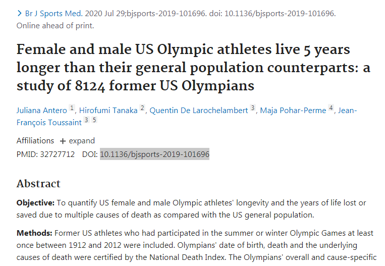 最新,2020年发表的美国8000多名参加过奥运会的运动员死亡率同样显著低于普通人,平均预期寿命长5.3岁。