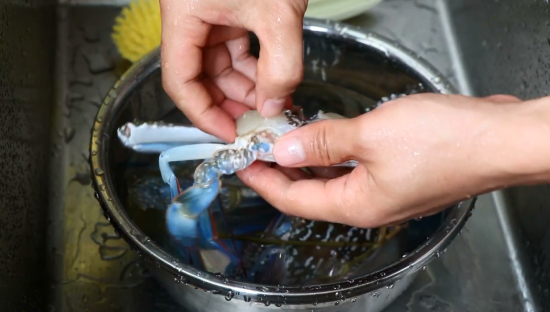 然后把蟹用刷子刷一下,尤其是腮的地方非常脏,要多刷几次。