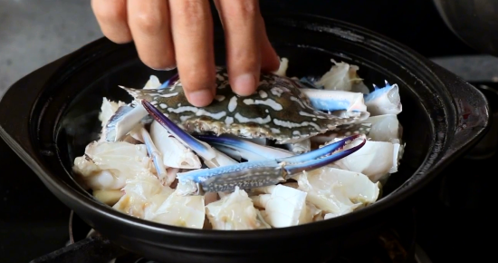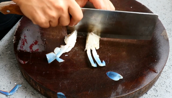 把蟹的趾甲去掉,然后把蟹的腿切下来,用刀把蟹腿拍一下,这样吃的时候就方便取肉了。