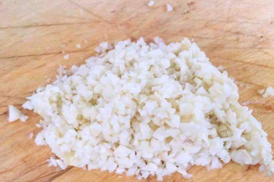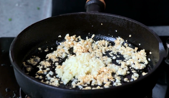 第三步:制作蒜蓉:热锅烧油,油热后先把一半蒜末放入炒香,